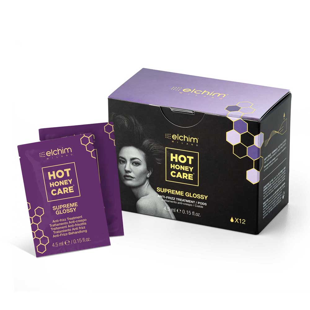 Hot Honey Care Supreme Glossy wurde in den Elchim-Laboren entwickelt und ist die einzige 3-in-1-Behandlung zum Trocknen, Stylen und Pflegen in einem einzigen Durchgang. Die Behandlung, kombiniert mit der Verwendung von Elchim-Haartrocknern, verwandelt das Haar beim Trocknen und Stylen mit sofortiger Wirkung . Die Wärme und der Luftstrom des Haartrockners aktivieren die in den Pads enthaltenen Wirkstoffe und trocknen, stylen und behandeln das Haar in einem einzigen schnellen Schritt und mit perfekter Gleichmäßigkeit. Durch Einsetzen der Supreme Glossy-Kapsel in den speziellen Kosmetikkonzentrator für Ihren Elchim-Haartrockner erzielen Sie sofort einen sichtbaren Anti-Frizz-Effekt mit weicherem und glänzenderem Haar.