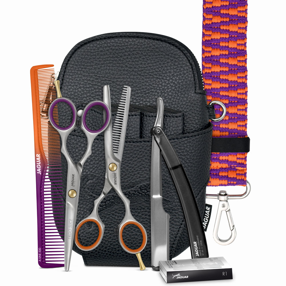 Professionelle Haarscheren der JAGUAR PRE STYLE Range aus Spezialstahl für sehr gute, andauernde Schärfe. Wahlweise in drei verschiedenen Griffvarianten erhältlich. Alle Sets beinhalten: Professionelle Haar- und Modellierschere JAGUAR PRE STYLE Rasierklingenmesser R1 M BLACK mit Metallklingenhalter für Standard-Rasierklingen Inkl. 10 Klingen R1 Haarschneidekamm A-LINE BICOLOR 7.25"" CROSSBAG (Holster),Format: B 14,5 x H 21,5 x T 3 cm.