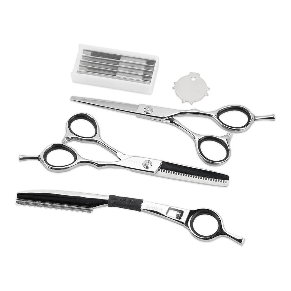 <ul><li>1 Haarschere</li><li>1 Effilierschere mit 28 Zähnen</li><li>1 Rasierapparat + 5 Ersatzklingen</li><li>1 Spannschlüssel</li></ul>